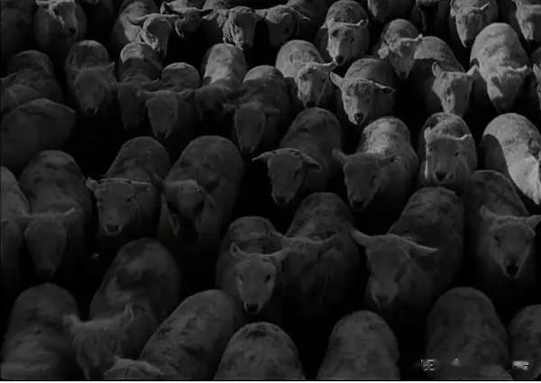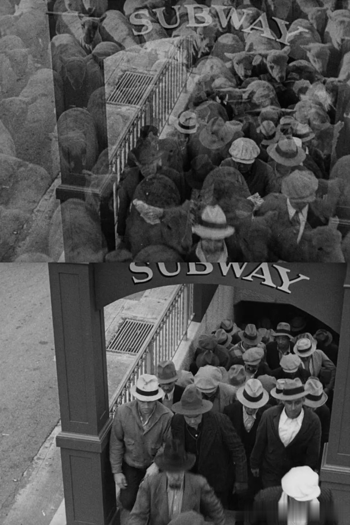 影片开头,人流和牲畜流镜头的切换——不知羊还是猪,分不清。