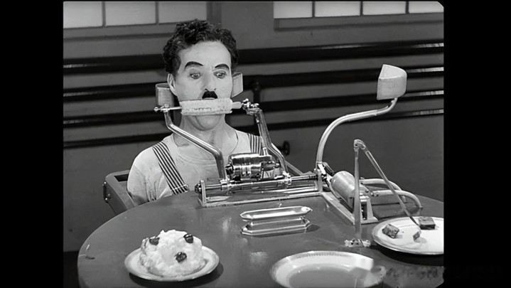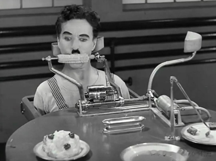 被机器喂着塞玉米——这个创意是超前想象的!卓别林的电影决不能简单的说是喜剧。