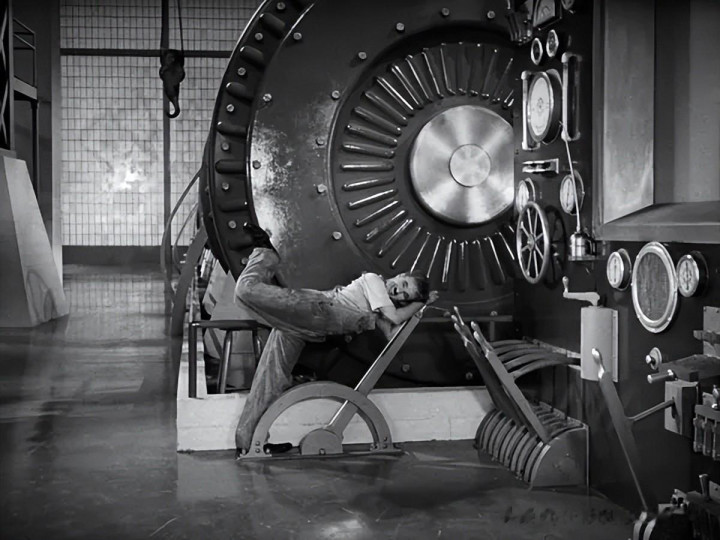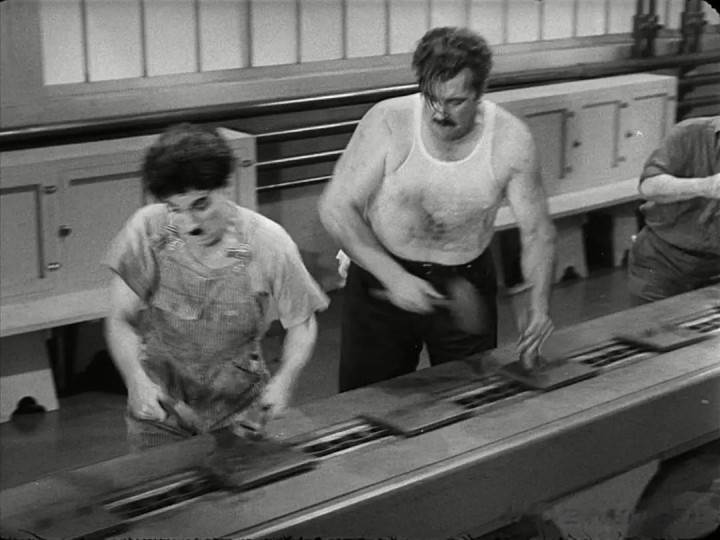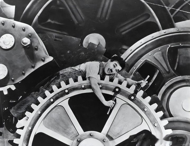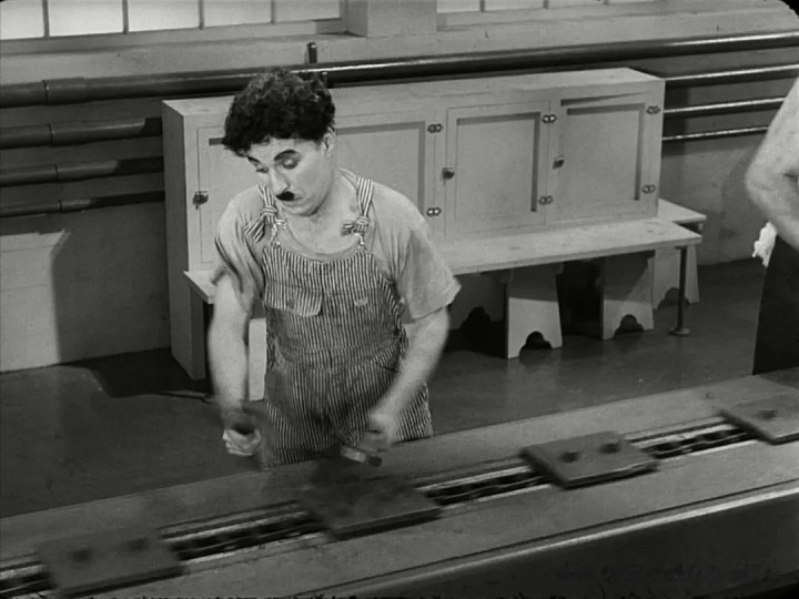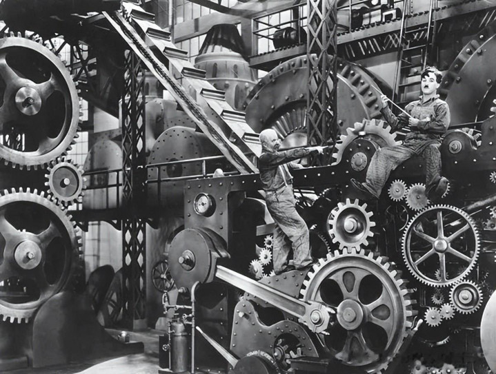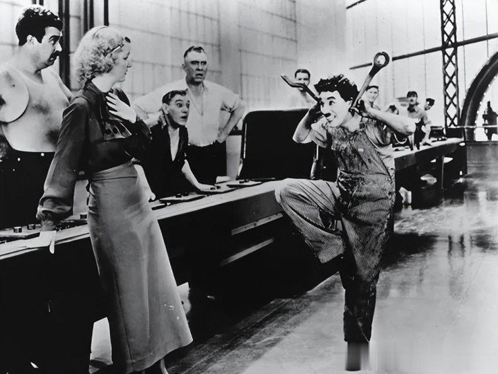 电影于1929年经济大恐慌之后拍摄,主角夏尔洛,是这个时代的悲剧代表人物。——当人不再是人,而是机器,他就在不断加快的传送带式的作业线上被弄得精神失常。