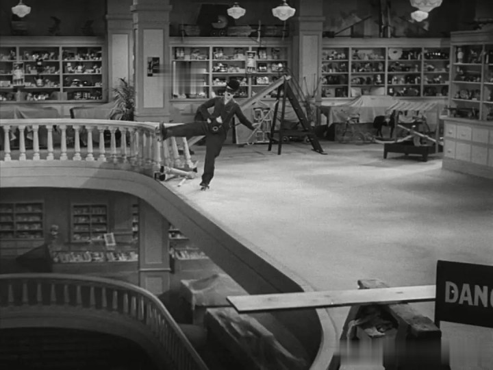 他蒙上眼睛去溜冰,在电影中一再出现,这表现的是摩登时代的速度和节奏!