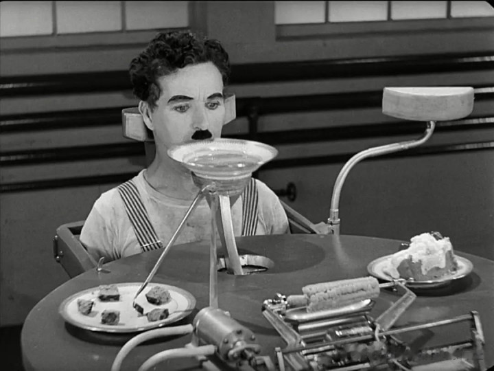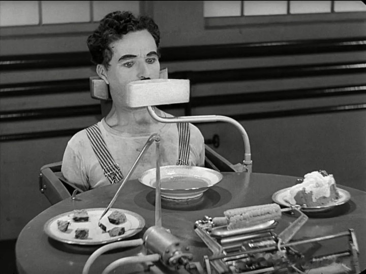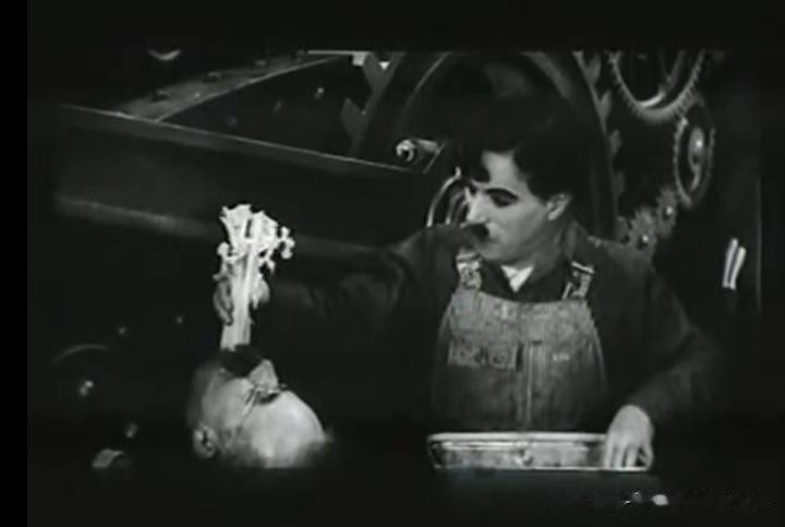 用机器喂饭,以节省工人时间这一段,讽刺意味十足,和前边的拧螺丝都属于名场面。